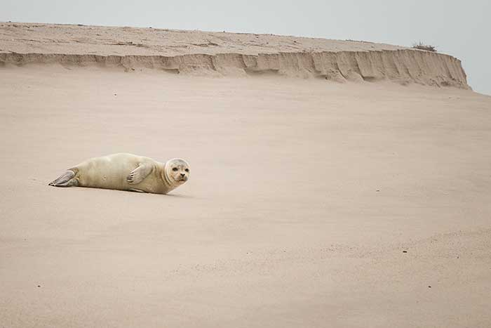 Der “Ellenbogen” ist in weiten Teilen entweder Natur- oder Vogelschutzgebiet. Während meines kleinen Ausflugs ist es fast menschenleer – nur Dünen und Sand, Wind und Wasser, Möwen und Schafe. Natur pur. Und am Ende, dort, wo es auf der Straße nicht mehr weitergeht und ein Weg durch die Dünen zum Strand führt, hier am nördlichsten Zipfel Deutschlands, wo ringsum nur noch die Nordsee schwappt und Dänemark nicht mehr weit ist (vier Kilometer bis Rømø), dort schauten mich ganz unerwartet, wie zur Belohnung, die hübschen Kulleraugen einer jungen Kegelrobbe an (streicheln verboten!), die am Strand lag und döste und genauso überrascht schien, wie ich selbst. Neben all dem Durchatmen, Schafe-zählen, Leuchtturm-im-Nebel-gucken und Noch-einen-Gang-herunterschalten war das der schönste Moment des Tages. Allein schon diese Begegnung war die Reise nach Sylt wert. Schwer zu toppen!