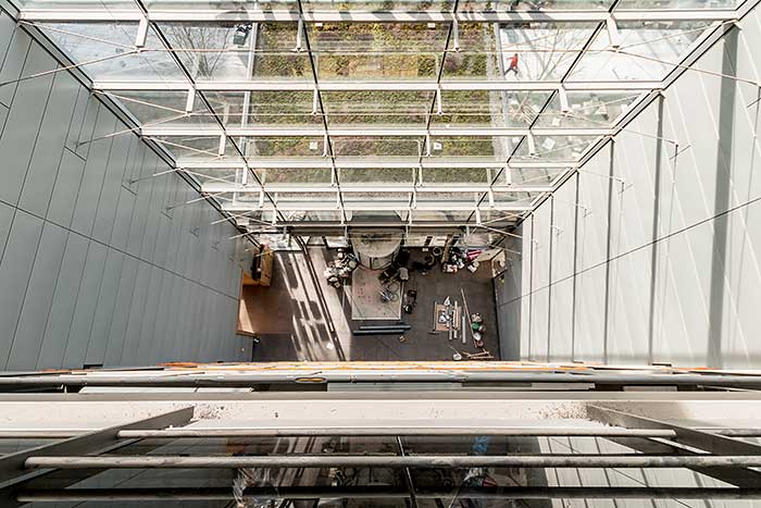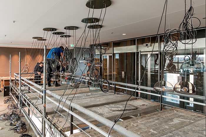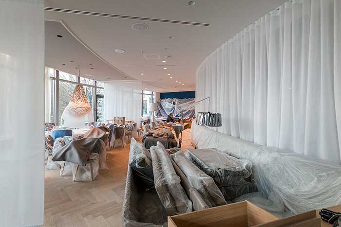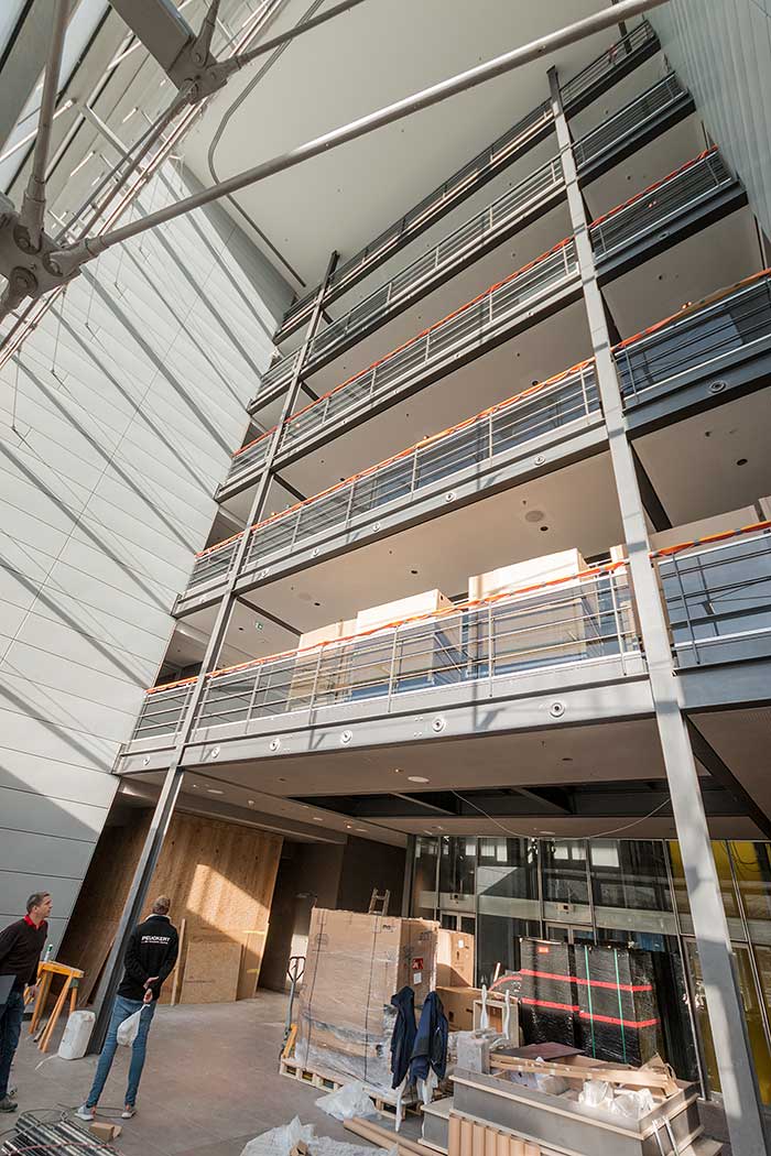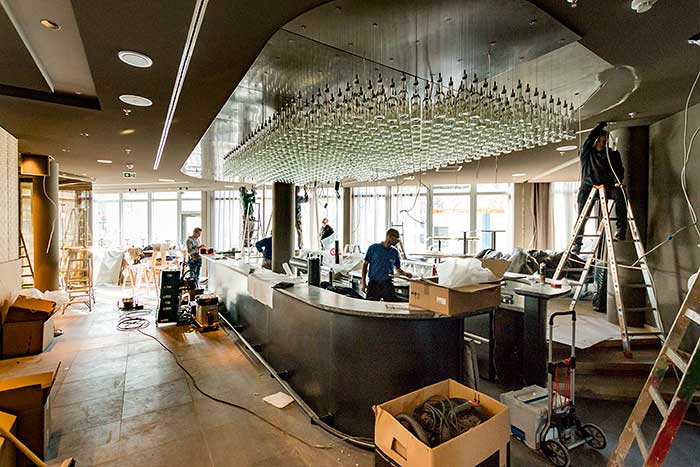 Mein Eindruck beim Stapfen über Folien, Kartonpappen und blankem Beton: Hier entsteht ein Juwel. Hell und licht wird es sein, das Steigenberger Hotel München, mit freundlichen Farben, modernem Interieur, einladendem Chic – und mit vielen schönen Design-Lampen in allen erdenklichen Größen. Das Foyer der Lobby ist beeindruckend hoch, erstreckt sich über sechs Etagen und punktet mit sehr viel Licht und Leichtigkeit. Später, zur Eröffnung, sollen überdimensionale Vorhänge von der 22 Meter hohen Decke ins Foyer hängen und mit den überdimensiopnalen weißen Stehlampen dem Entré den letzten visuellen Schliff geben.