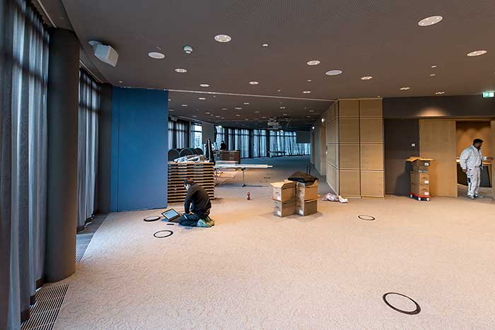 Weiter oben befinden sich auf 1200 Quadratmetern Fläche imposante Meeting- und Konferenzräume mit ausgeklügelter Ton- und Lichttechnik, vielen Projektionsmöglichkeiten, direktem Küchen-Anschluß, weichem, schallisolierendem Teppich und der Möglichkeit, über die breiten Fensterfronten viel Licht hineinzulassen.