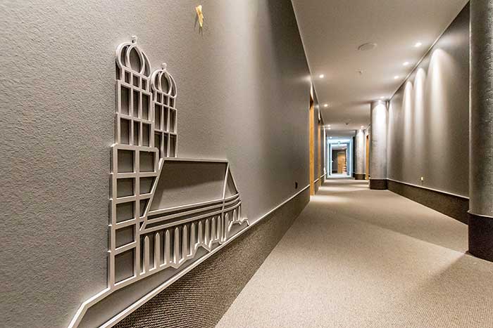 Die Rezeption liegt nicht zentral in der Lobby, sondern erstreckt sich in einen Raum zur rechten Seite. Geht man durch den lichten Eingangsbereich, führt der Weg in die Kamin-Lounge, die Cinemathek, die Bibliothek und die gastronomischen Bereiche, wo später einmal die imposante Bar mit dem “Bierkristall” (50 Biersorten!) Dreh- und Angelpunkt des Hauses sein werden.