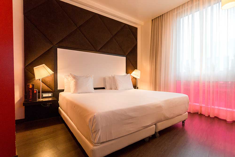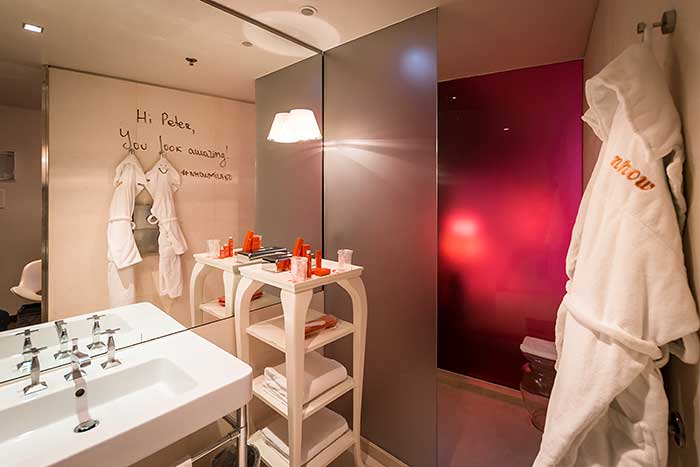 Das nhow Milano ist ein “Design, Art and Fashion Hotel”. Die 246 Zimmer sind sehr hell und wirken leicht und luftig. Viel Weiß, dazu kontrastreiche Rot- und Lila-Töne. Eine pinkfarbene Plexiglasscheibe unter dem Fenster meines Schlafzimmers leitet angenehm warmes Licht in den Raum. Eine weinrote , lichtdurchlässige Trennwand zwischen Bett und Bad wirkt in beiden Räumen wie ein energetischer Farbklecks. Das Bad ist angenehm groß und hell und unter der Dusche hätten auch zwei Personen bequem Platz.