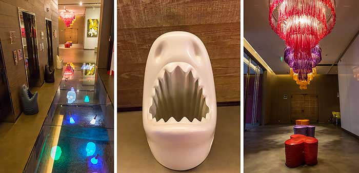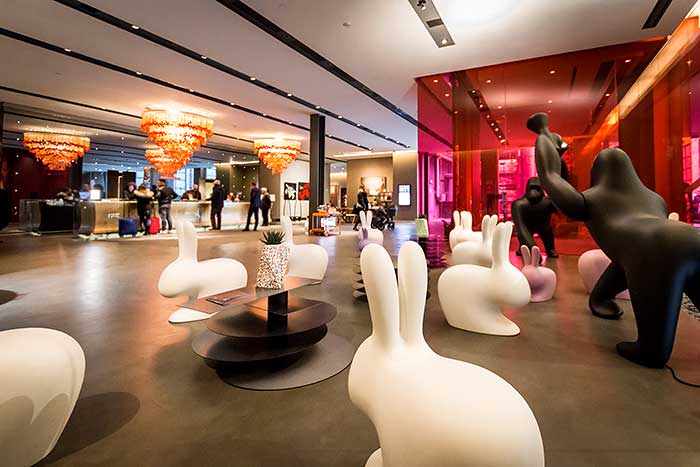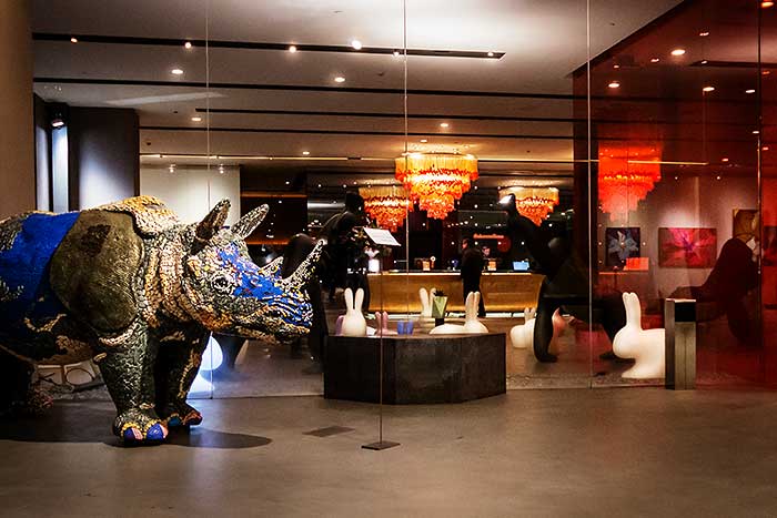 Der Eingang des nhow Milano wird von einem farbenfrohen Rhinozeros bewacht, in der Lobby begrüßen leuchtende Hasen die Hotelgäste und vor den Fahrstühlen reißen Haifische gierig ihre Mäuler auf. Kleine und große Besucher fühlen sich bei der Ankunft in diesem Hotel wie Alice im Wunderland: Pop-Art, Skulpturen, Gemälde, Möbel, Fotografien – wo auch immer man hinschaut: Kunst, Kunst, Kunst!
