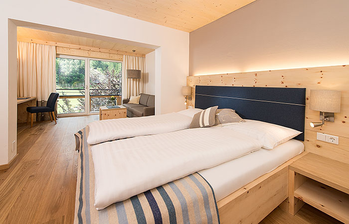 „Wo es noch echt ist“ lautet der Sinnspruch des Hauses. Die Eigentümerfamilien Herzog und Blumenkamp geben sich alle Mühe, diesem Motto gerecht zu werden: 49 Bio- und Natur-Zimmer in Massivholz-Bauweise, ausgestattet mit Eichenholz-Böden, Zirbenholz-Möbeln, Villgrater-Natur-Schafwollbetten und Wollstoffen laden zum Bleiben ein. Es riecht gesund, wenn man die Zimmer betritt und der unaufdringliche Zirbenholz-Duft reguliert den Kreislauf im Schlaf. Er “fährt Dich runter”; und genau das will man doch im Urlaub, oder? Ich habe selten so gut geschlafen wie hier.